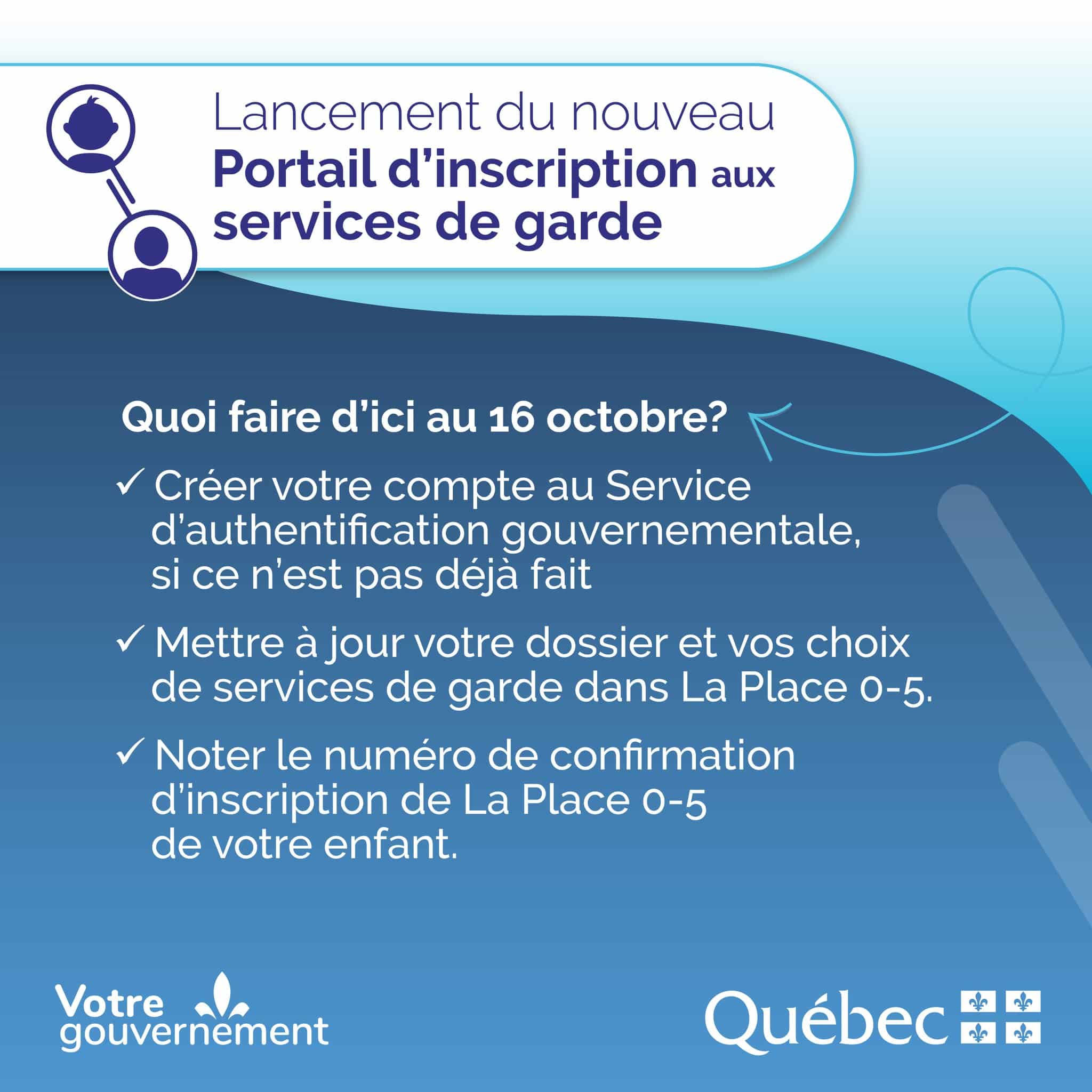 • Action immédiate requise : Tous les parents sont invités à créer dès maintenant leur compte sur le Service d’authentification gouvernementale. Ce compte, qui utilise une adresse courriel valide, sera indispensable pour accéder au nouveau portail des services de garde.
